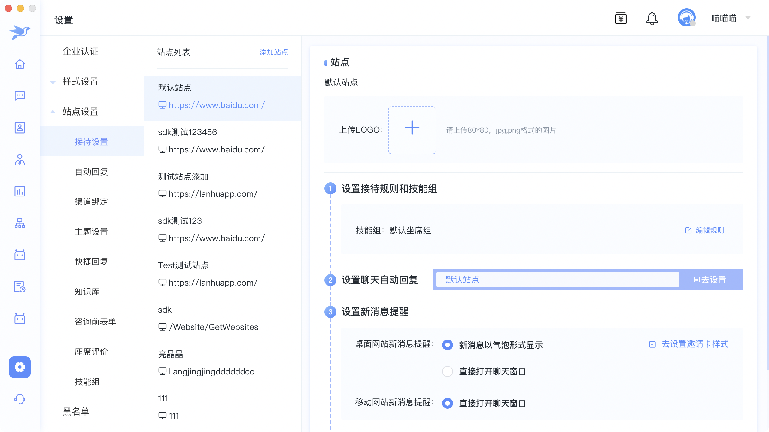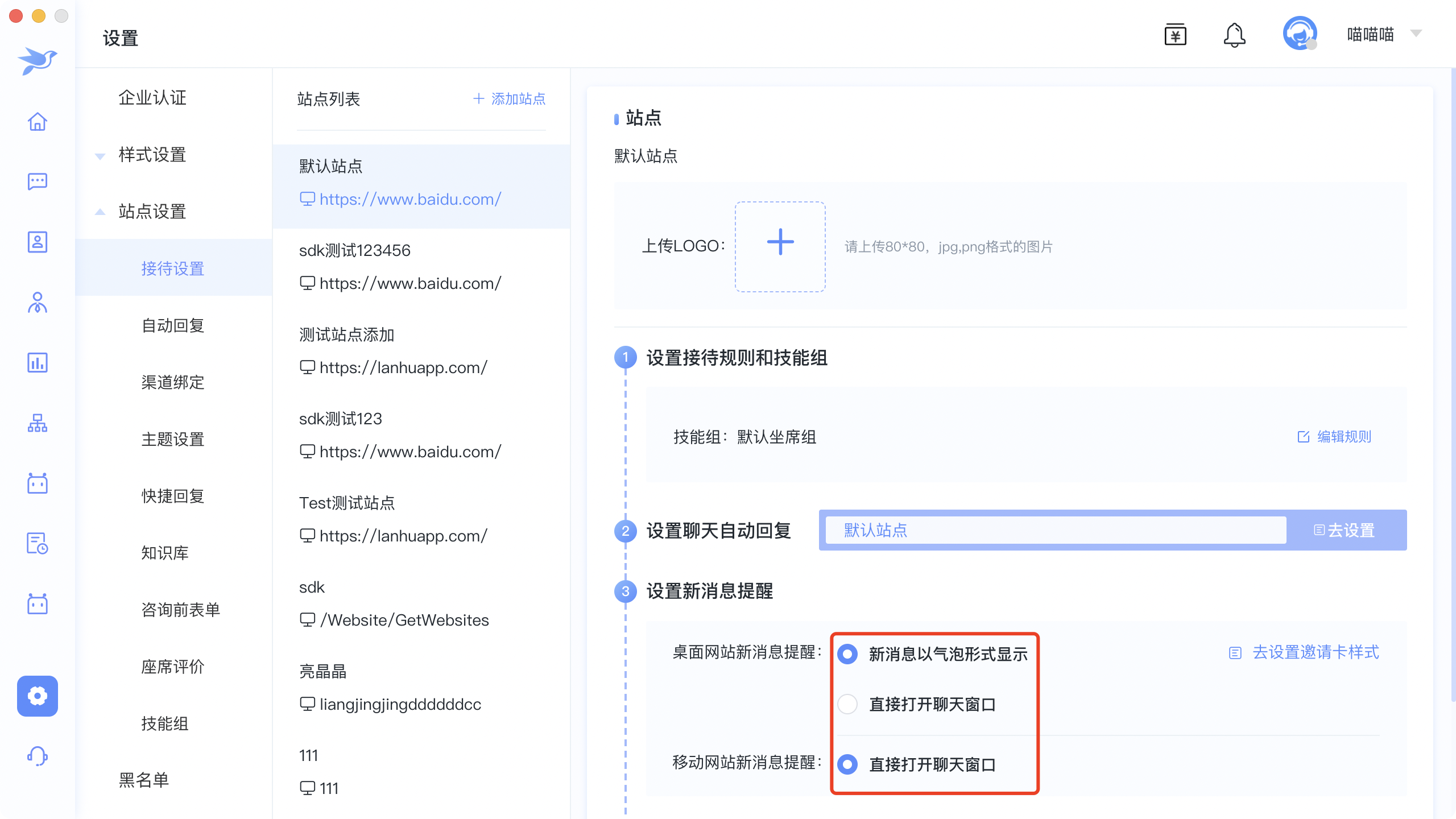 1.2.编辑站点配置:上传站点logo,在访客端聊天窗口显示