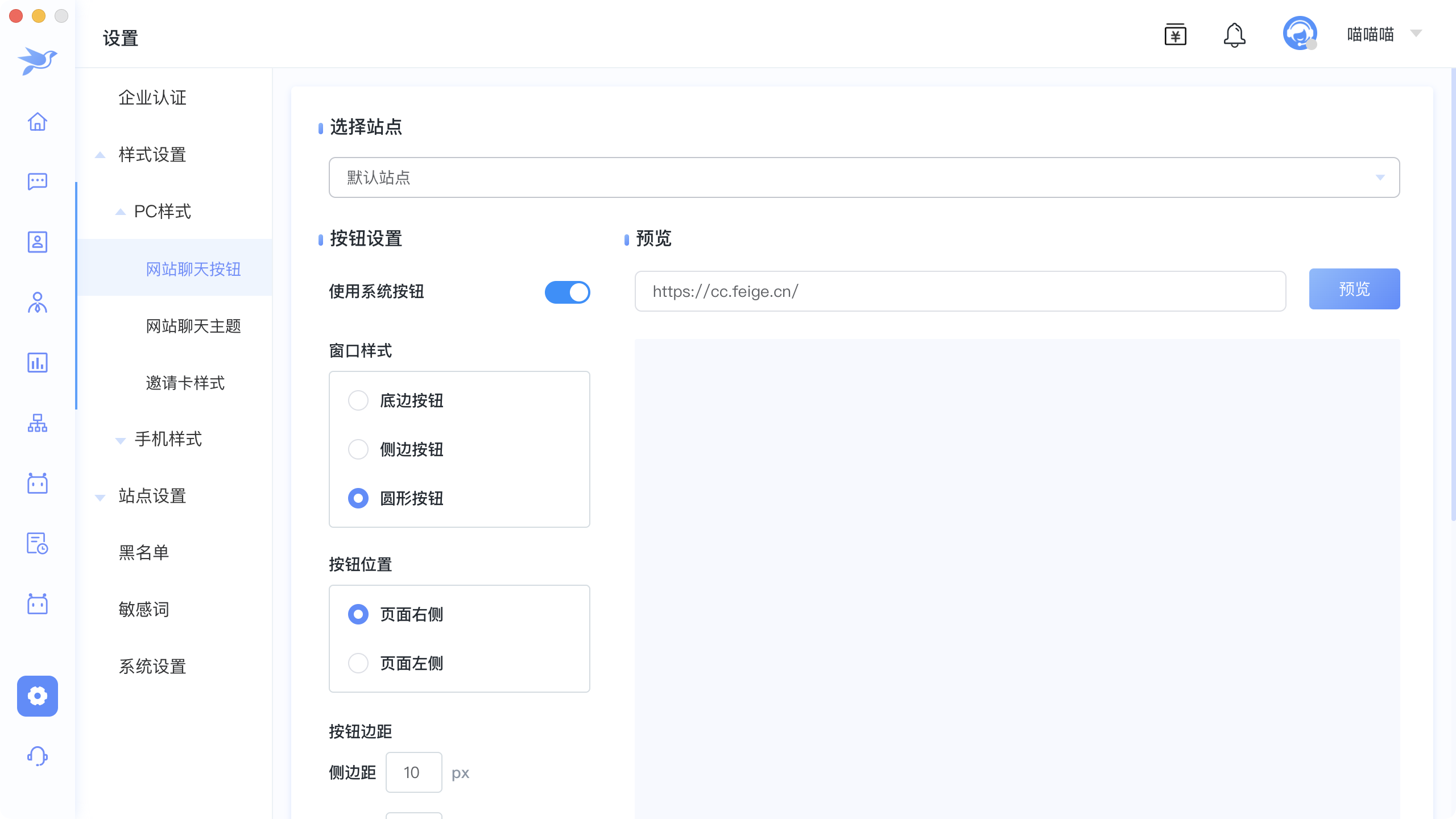 选择聊天按钮样式,系统提供底边按钮,侧边按钮,圆形按钮三种选择可以根据喜好设置自己喜好的按钮样式