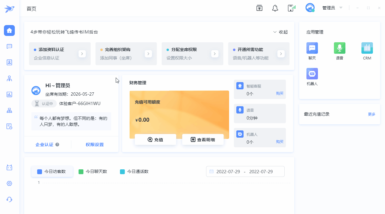 1.1.登录成功后,点击左侧底部设置菜单,点击二级菜单组织架构中的企业认证进行企业认证操作