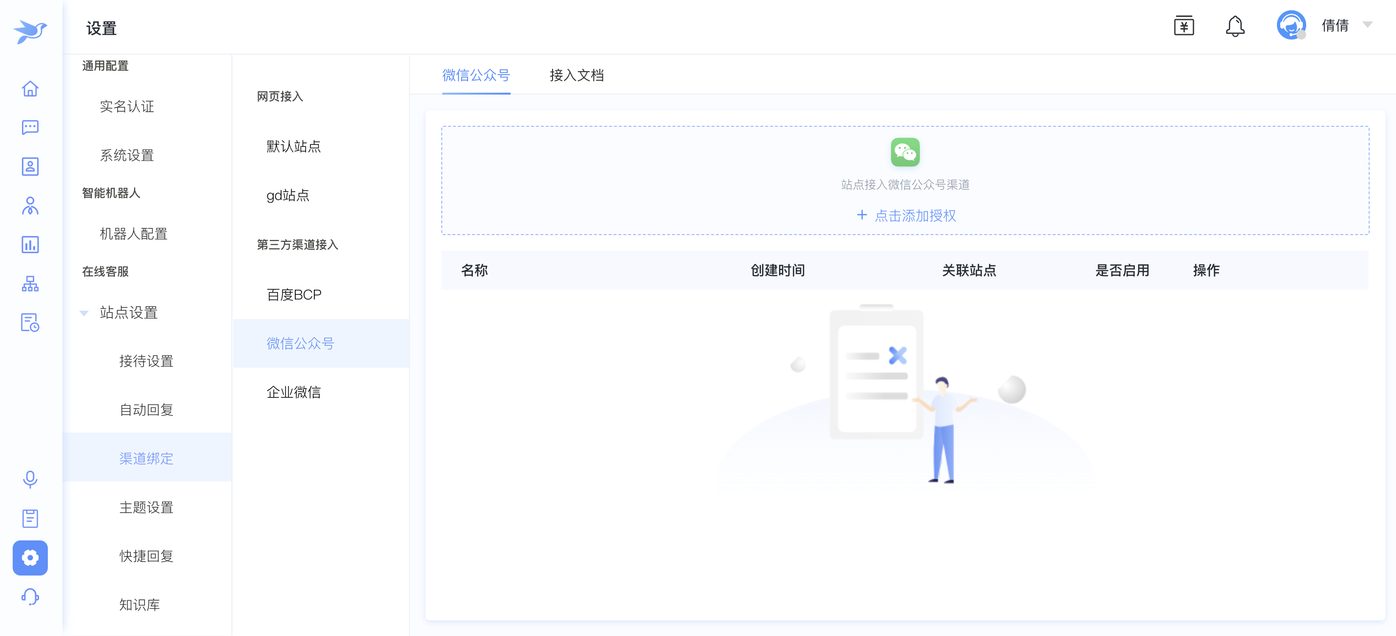 2.1.选择渠道绑定,点击微信公众号