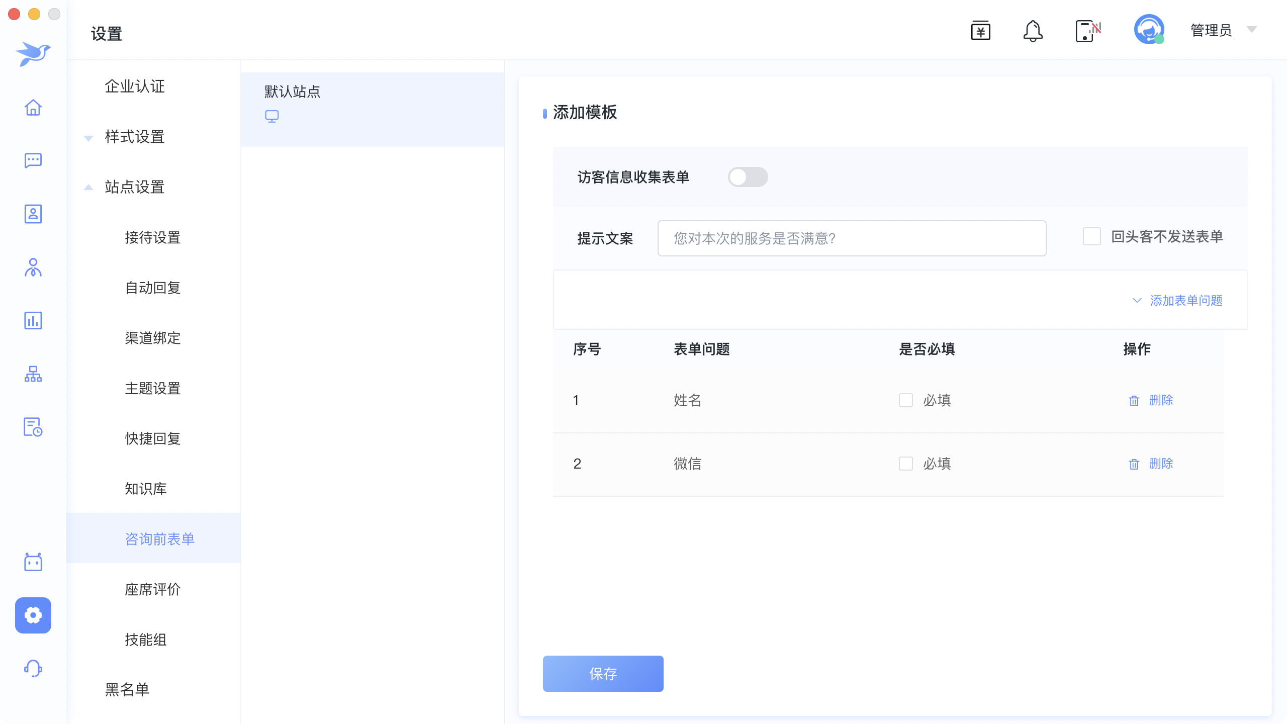 1.2.点击点击添加表单问题,设置表单模板,输入模板名称,设置表单收集开关,表单提示文案,以及收集信息的字段,是否必填等信息 保存表单