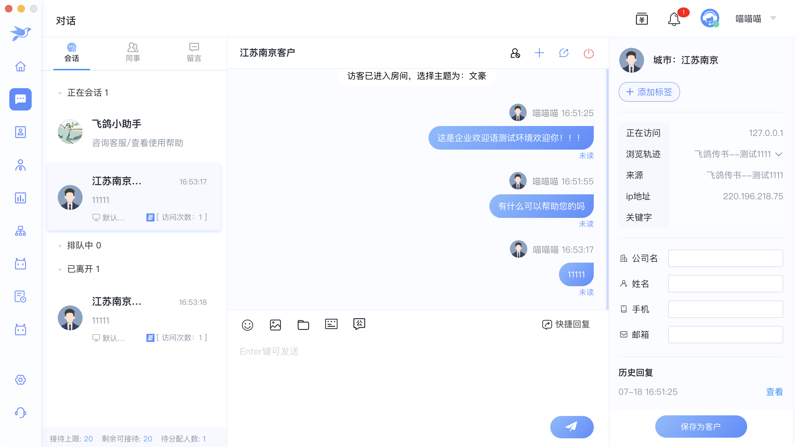 右侧居中区域,可以编辑访客信息,点击保存为客户,保存访客到客户列表