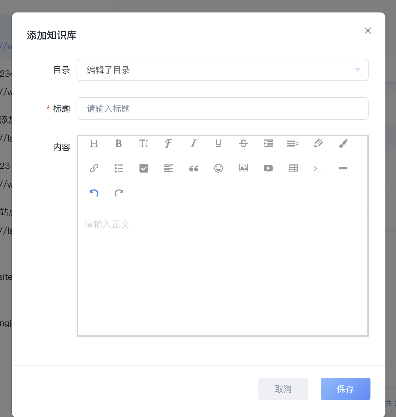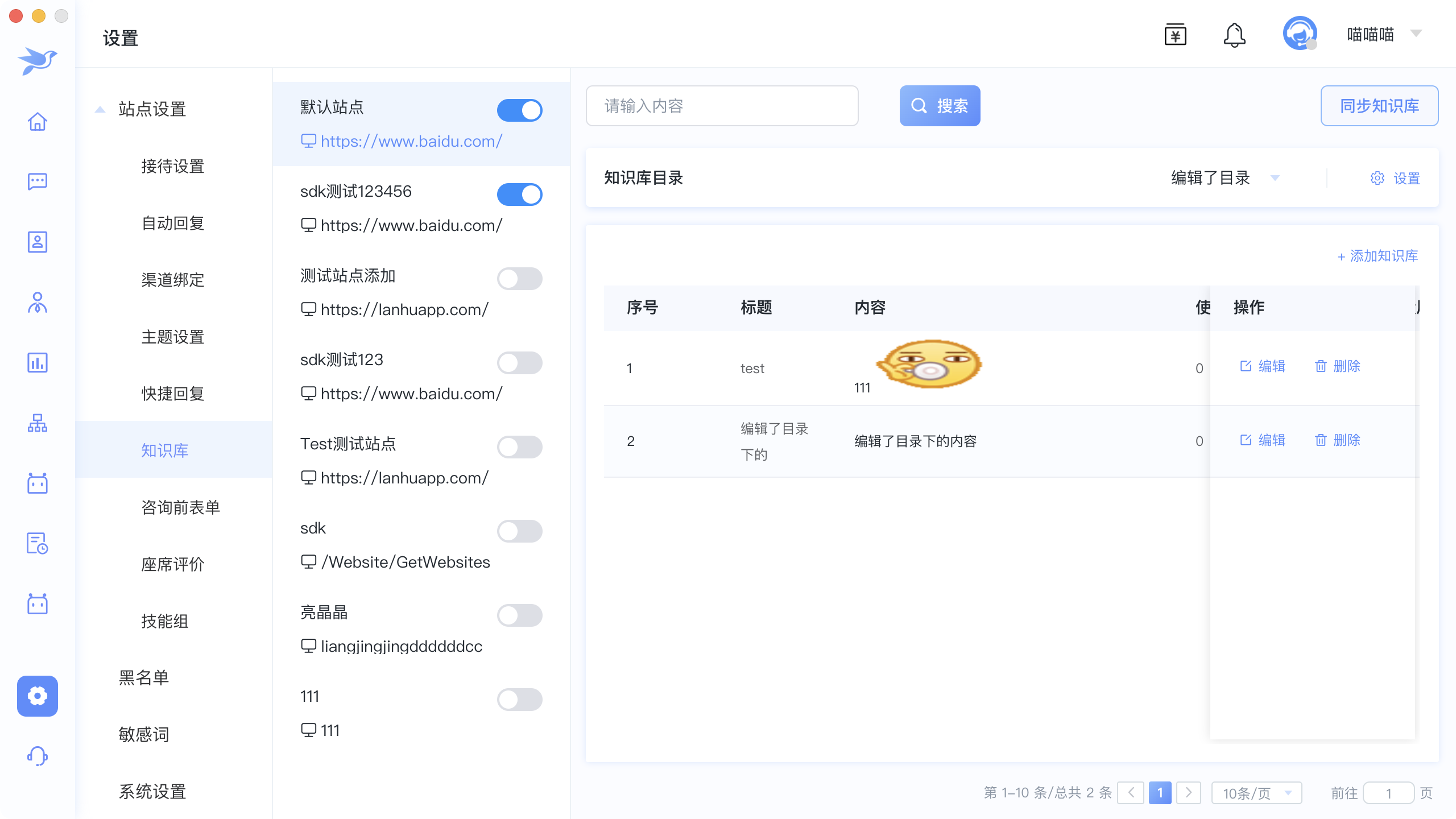 1.2.点击左侧选择对应站点,然后点击右侧设置添加知识库目录,点击添加知识库,选择对应目录,输入标题和内容保存