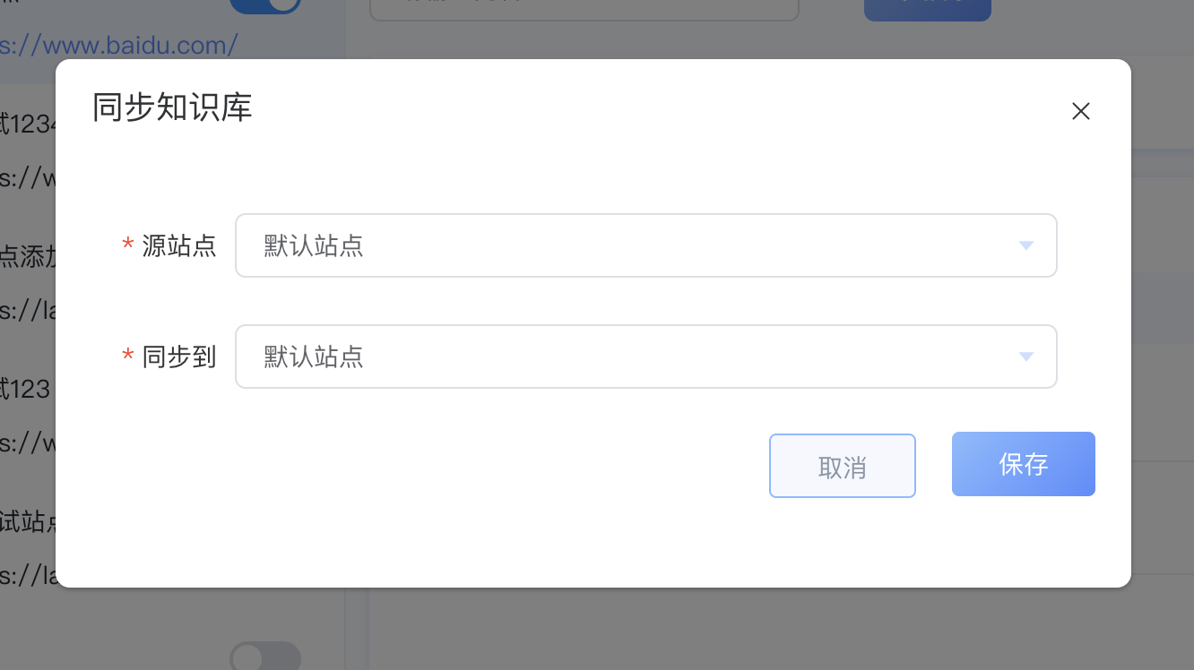 1.3.同步知识库:存在多个站点的情况,知识库内容相同或相似度较高,可以使用同步知识库功能同步,只需设置好一个站点的知识库,同步给另一个站点,后续修改不会自动同步 源站点:已经设置好知识库内容的站点