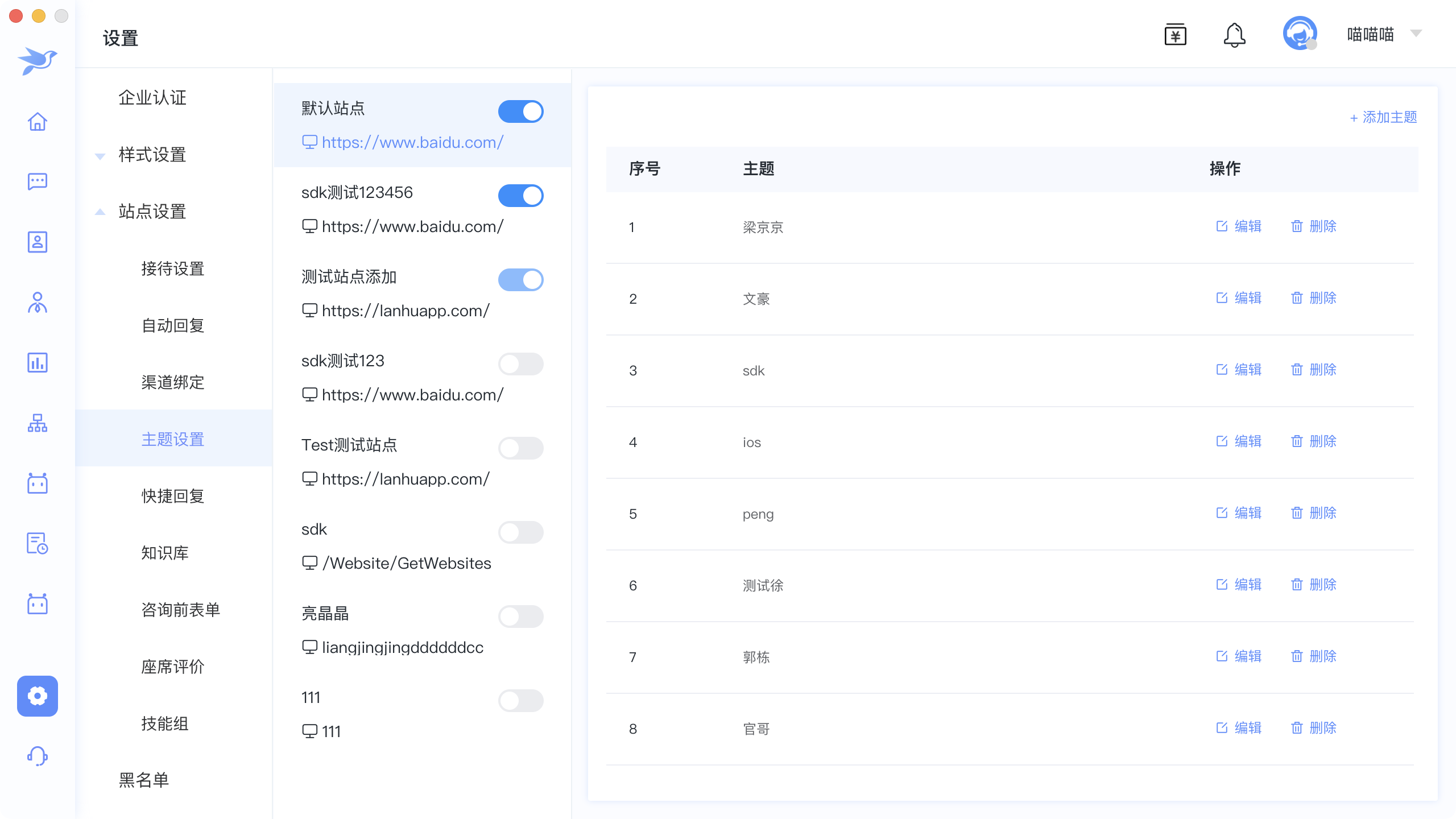 1.1.针对站点设置主题,开启后,访客访问网站会有主题选择,访客选择主题进入聊天,可以在分配规则中进行不同主题分配给不同客服配置